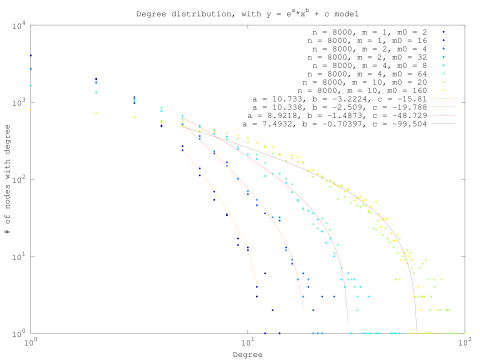 Degree distributions of the Barabási-Albert model, across a range of values of the m and m0 parameters. Nonlinear, least-square fits of power-law models, for the highest m0 for each m of the data-sets.