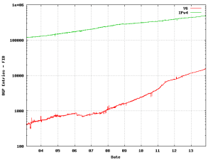 IPv4 and IPv6 BGP FIB sizes: # of prefixes on a logarithmic scale. Courtesy of Geoff Huston.